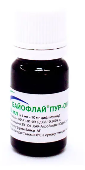 Байофлай пур-он (200 мл) являє собою лікарський препарат у формі розчину для зовнішнього застосування, призначений для захисту великої рогатої худоби від двокрилих комах на пасовищі.