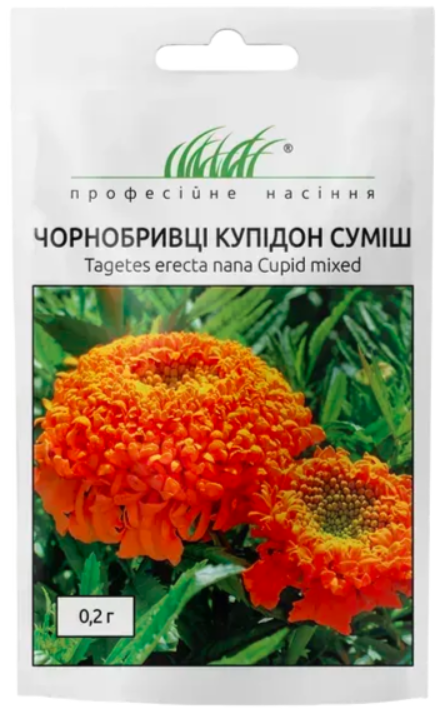 Чорнобривці прямостоячі Купідон (Tagetes erecta nana Cupid). Компактний рясно квітучий однорічник, висотою 25-30 см. Сильно галузисті стебла утворюють щільний кущик обернено пірамідальної форми. Суцвіття великі, діаметром до 10 см, з густо махровою серединкою, увінчаною по краю широкими пелюстками, жовтого та помаранчевого кольорів. Цвітіння рясне та тривале з червня до жовтня. Швидкоросла, світло теплолюбива, невибаглива до ґрунту та вологи рослина. Для раннього цвітіння насіння висівають на розсаду на початку квітня. Сходи з'являються через 5-6 днів, пікіровку проводять у фазі 2-3 справжніх листочків. На постійне місце висаджують, коли мине загроза заморозків. Посів у відкритий ґрунт проводять у травні на глибину 1,5-2 см. Рекомендується для клумб, рабаток, ваз та балконів.