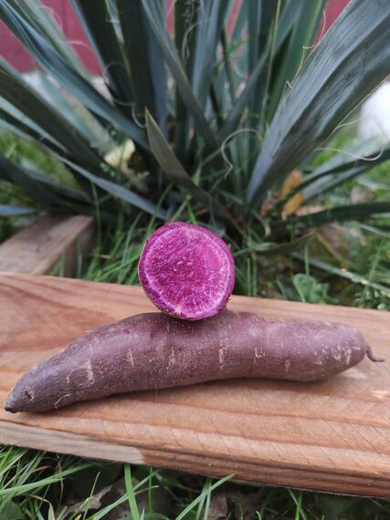 Фіолетовий батат – це сорт солодкої картоплі з темно-фіолетовою м'якоттю та шкіркою, який багатий на антиоксиданти (антоціани). Він має насичений смак, його колір зберігається під час приготування, що дозволяє використовувати його для кулінарних експериментів та декору страв. Широко використовується в десертах, супах, пюре та напоях. Для розмноження батат рідко використовує насіння; замість цього беріть бульби або живці, пророщуючи їх у воді чи вологому субстраті при 20-25°C. Візьміть здорову бульбу, помістіть її наполовину в банку з водою, і через 2-4 тижні з’являться паростки – тендітні, але сповнені життя, готові до висадки. Батат слід вирощувати на мульчі з агроволокна плівки чи соломи, щоб його паростки не вкорінилися додатково, інакше вся сила перейде до них і Ви не отримаєте гарних плодів.
