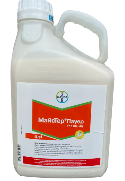 Майстер Пауер – це потужний післясходовий гербіцид системної дії для боротьби з однорічними та багаторічними дводольними і злаковими бур’янами в посівах кукурудзи. Містить три ефективні діючі речовини (форамсульфурон 31,5 г/л, йодосульфурон-метил-натрій 1 г/л, тієнкарбазон-метил 10 г/л) та антидот ципросульфамід (15 г/л), що забезпечує високу селективність до культури. Проникаючи в рослини, гербіцид блокує синтез амінокислот, зупиняючи ріст бур’янів уже в перші години після обробки. Має потужну «спалюючу» дію на вегетуючі бур’яни та ґрунтову активність, що запобігає появі нових сходів. Оптимальна фаза застосування – 2–5 листків кукурудзи, норма внесення – 1,25–1,5 л/га.