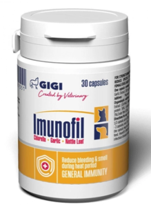 GiGi Imunofil - чудова харчова добавка для загального зміцнення імунітету вашого улюбленця. Зменшує специфічний запах і кровотечу у самок собак і котів під час тічки.
