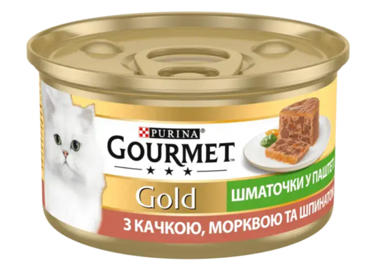 Повна назва продукту: GOURMET Gold®. Шматочки в паштеті. З качкою, морквою та шпинатом. Консервований порційний повнораціонний корм для дорослих котів.
