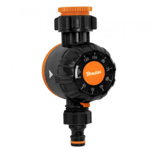 Механічний таймер потоку води виготовлений з високоякісного пластику. Пристрій дозволяє збільшити економію води, що робить його незамінним на ділянці і в саду. Годинник оснащений ручкою, яка встановлює відповідний час поливу, а після його закінчення подача води автоматично перекривається.