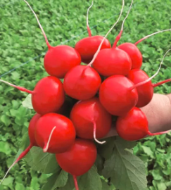 Плоди яскраво-червоні з білою серцевиною. Однорідні, округлі, щільні, не розтріскуються і не утворюють порожнеч. Середня вага – 20-30 г, в діаметрі – близько 3-4 см. М'якоть смачна, соковита, з пікантною, легкою гостротою. Містить велику кількість корисних мікроелементів. Гібрид підходить для отримання ранньої продукції, реалізації в пучках або на вагу. Використовується в кулінарії у свіжому вигляді.