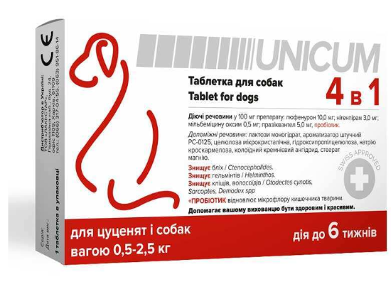 Unicum (Унікум) 4 в 1 - Протипаразитарні таблетки з пробіотиком від бліх, кліщів і гельмінтів для собак (1 таблетка) 0,5-2,5кг