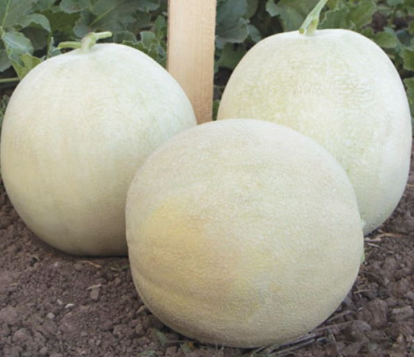 Плід. Високо-округла форма. Плід кремово-білий із слабо вираженою сіткою. Середня вага: 1,5-2,5 кг. М'якуш зеленувато-білого кольору, солодкий і хрусткий. Вміст цукру: 15-16%