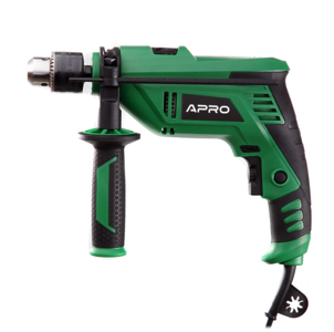 Ударний дриль APRO 13/850 оснащений щітковим двигуном потужністю до 850 Вт, що дозволяє ефективно працювати з деревиною, металом та бетоном. Максимальна частота обертів 3000 об/хв забезпечує точність і швидкість свердління, а ударний режим значно покращує продуктивність при роботі з твердими матеріалами.