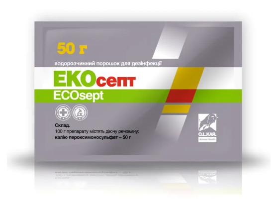 Для загальної дезінфекції заздалегідь очищених поверхонь та обладнань необхідноприготувати 1%-й розчин Екосепт (100 г препарату на 10 л води). Експозиція складає від 60 хвилин до 2 годин.