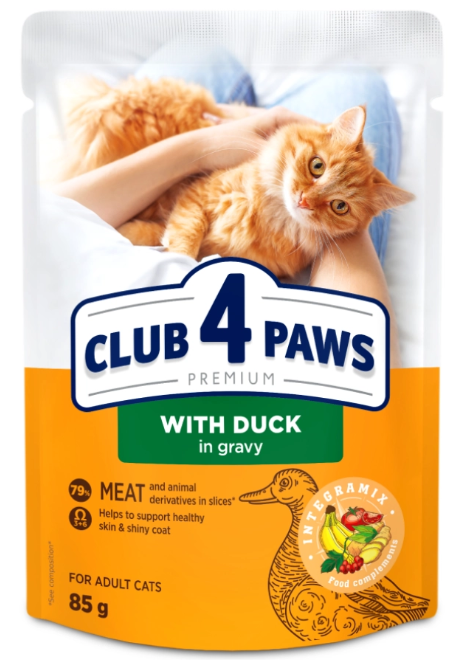 - Вологий корм Клуб 4 Лапи зі шматочками качки для котів має ідеальне співвідношення білків і жирів, а саме 8.5/5;