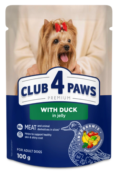 Клуб 4 Лапи з качкою в желе для собак містить унікальну формулу INTEGRAMIX, що включає сушені томати, імбир, глід і банани.