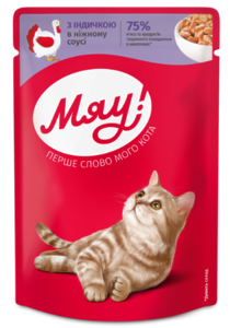"Мяу" Повнораціонний консервований корм для дорослих котів з індичкою в ніжному соусі.