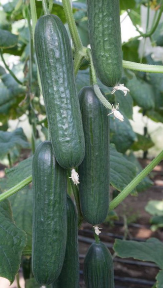 Плоди однорідні, гладкі, темно-зеленого кольору з щільною, соковитою і хрусткою м'якоттю. В одній пазусі формується 3-5 плодів довжиною 19-20 см. Відрізняються стійкістю до переростання.