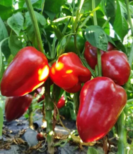 Плоди видовжено-конічні, великі — до 16 см у довжину і 9 см у діаметрі, масою 150–200 г. М’якуш щільний, товстостінний — 7–9 мм, дуже соковитий і солодкий. Шкірка блискуча, міцна, з яскраво-червоним забарвленням при повному дозріванні. Плоди добре зберігаються після збору, зберігаючи товарний вигляд, не пошкоджуються при транспортуванні. Придатні для свіжого споживання, фарширування, термічної обробки, консервування.