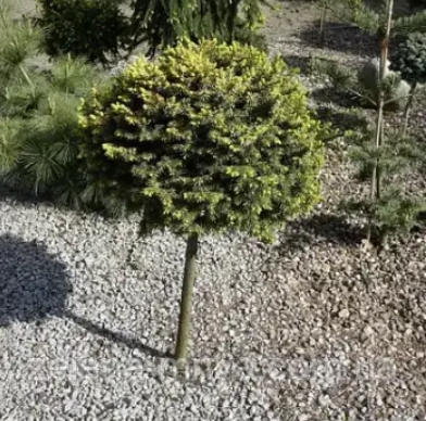 Ялина сербська «Певе Тіджін» (Picea omorika Peve Tijn) на штамбі — це ефектний карликовий сорт із кулястою або подушкоподібною кроною, що повільно росте (приріст 6-8 см на рік). Хвоя триколірна: зверху жовто-зелена, знизу — сріблясто-блакитна. Висота...