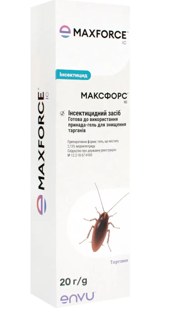 Активною діючою речовиною гелю від тарганів максфорс ic виробника Баєр є імідаклоприд, що викликає конвульсії, параліч та загибель комах. Засіб випускається у формі шприца від тарганів і відразу готовий до використання в побутових умовах. Наносити його рекомендується в місцях найбільшого скупчення та переміщення комах. Також слід перекрити доступ шкідників до води.