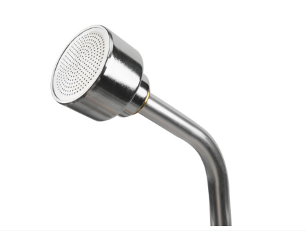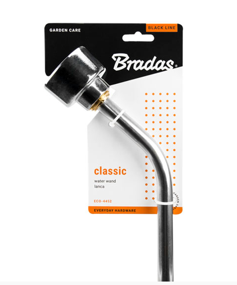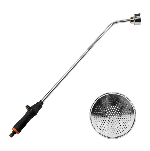 Зрошувач для ручного поливу з довгою металевою штангою та ситечком з нержавіючої сталі. Оснащений краном для плавного регулювання інтенсивності потоку води. Ергономічна ручка має м'яке покриття для зручності користування.